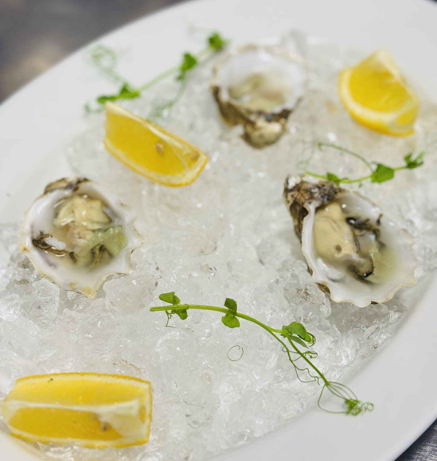 - Ostrygi otwierane przy gościach podane na lodzie z sosem mignonette